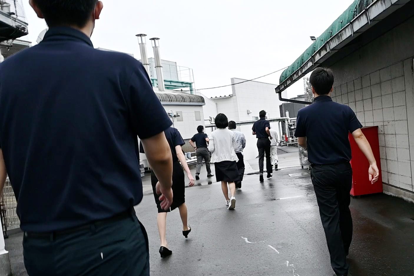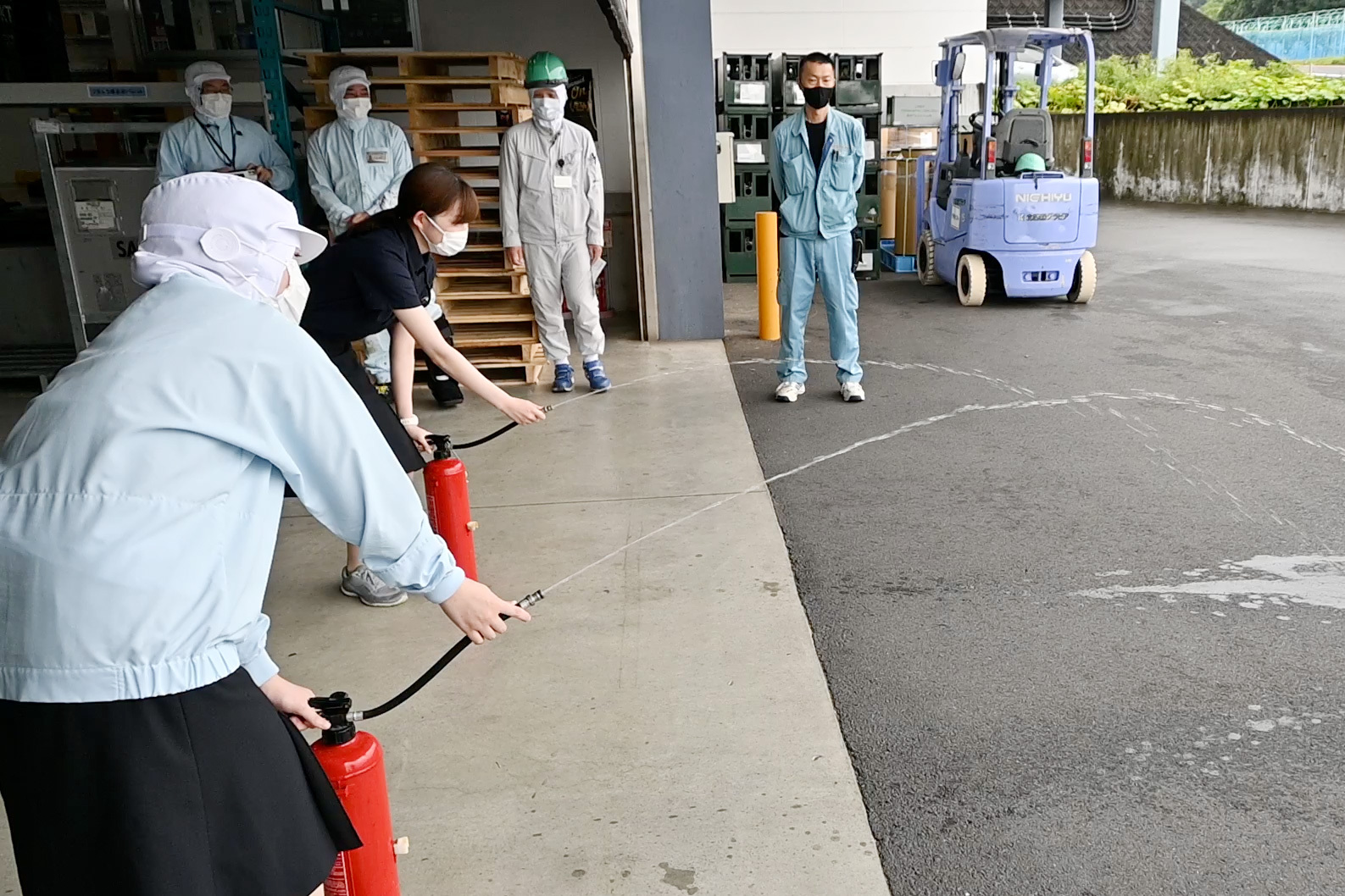 消火栓のデモンストレーションを新入社員中心に行っていましたが、