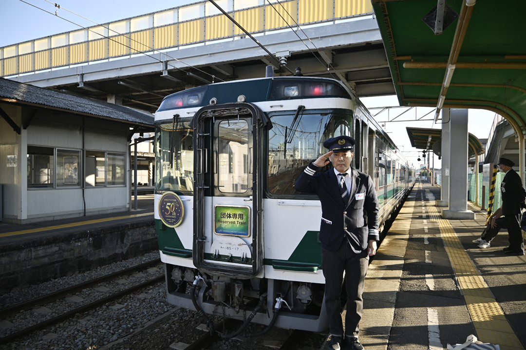 集合場所に到着すると、車掌姿の奥田社長がお出迎えしてくださり電車の旅が始まりました。