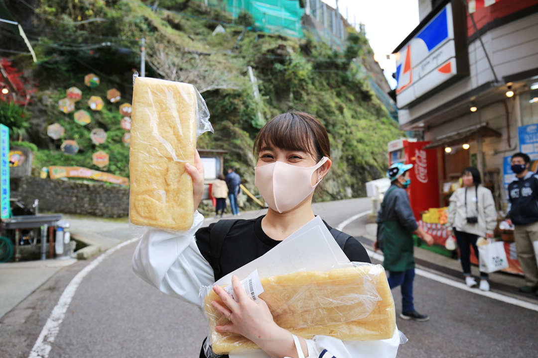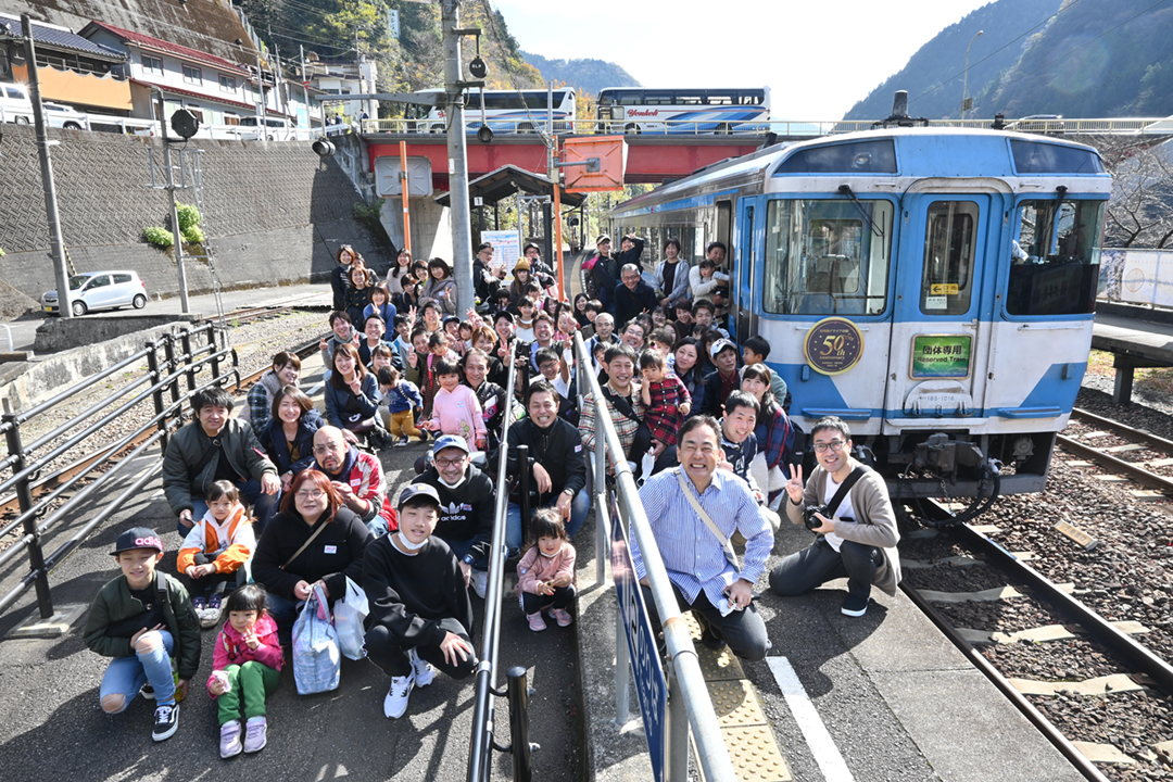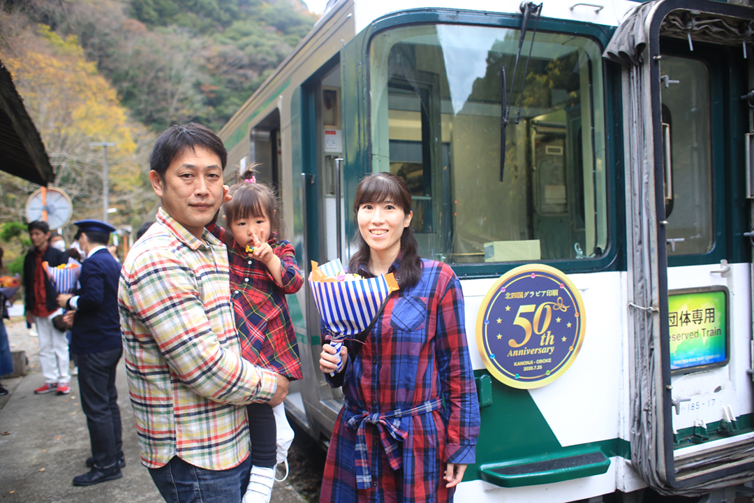 やるとなったら本気でやるのが北四国流、車内販売から車内アナウンス、とにかくすべてに全力投球!当日は社長自ら車掌に扮し(!)、電車ムードを盛り上げます。丁度紅葉の時期に実施できたのはケガの功名とでも言いましょうか、車窓から見える秋色の山々は実に美しく、乗客の心を魅了します。大歩危駅に到着後は遊覧船で川下り。天候にも恵まれ、煌めく川面と迫り来る紅葉のコラボレーションはコロナ疲れの心を十分に癒やすものでした。その後はボリューム満点のお弁当を堪能し帰路へ。帰りの工程でも、途中の坪尻駅で11.22(いい夫婦の日)のサプライズイベント!老いも若きも初々しい姿で記念ショットを撮らせていただきました。すべての工程を終え、観音寺駅に到着した頃には皆ウトウト気分。