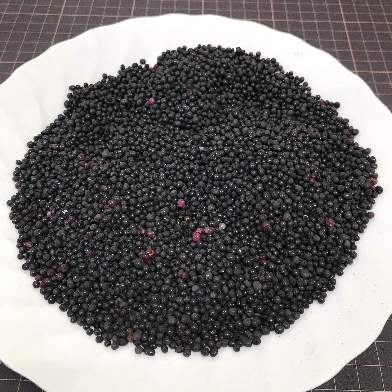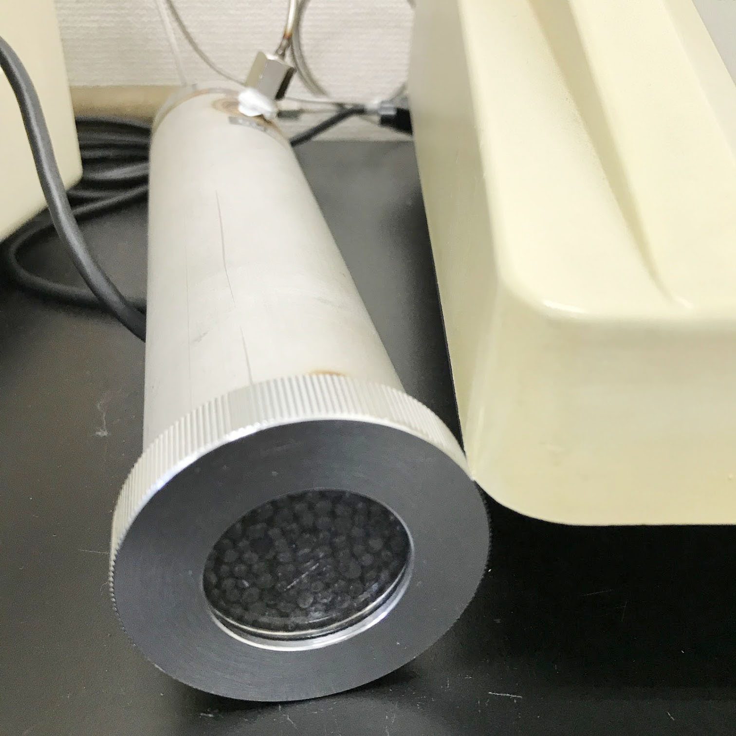 黒い粒々はガスクロの一部のシリカゲルです。シリカゲルが湿っていると正確な測定結果がでないため、定期的に交換しています。湿っているとピンク、乾燥すると茶色っぽい色に変わります!