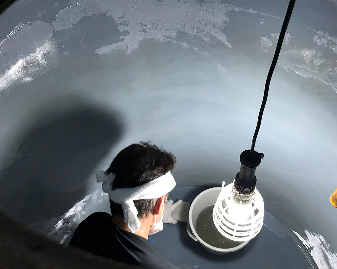 (上左)製版に必要な水が入っているタンク。そのタンク内に潜り込んで内面の汚れを取り除きます。
