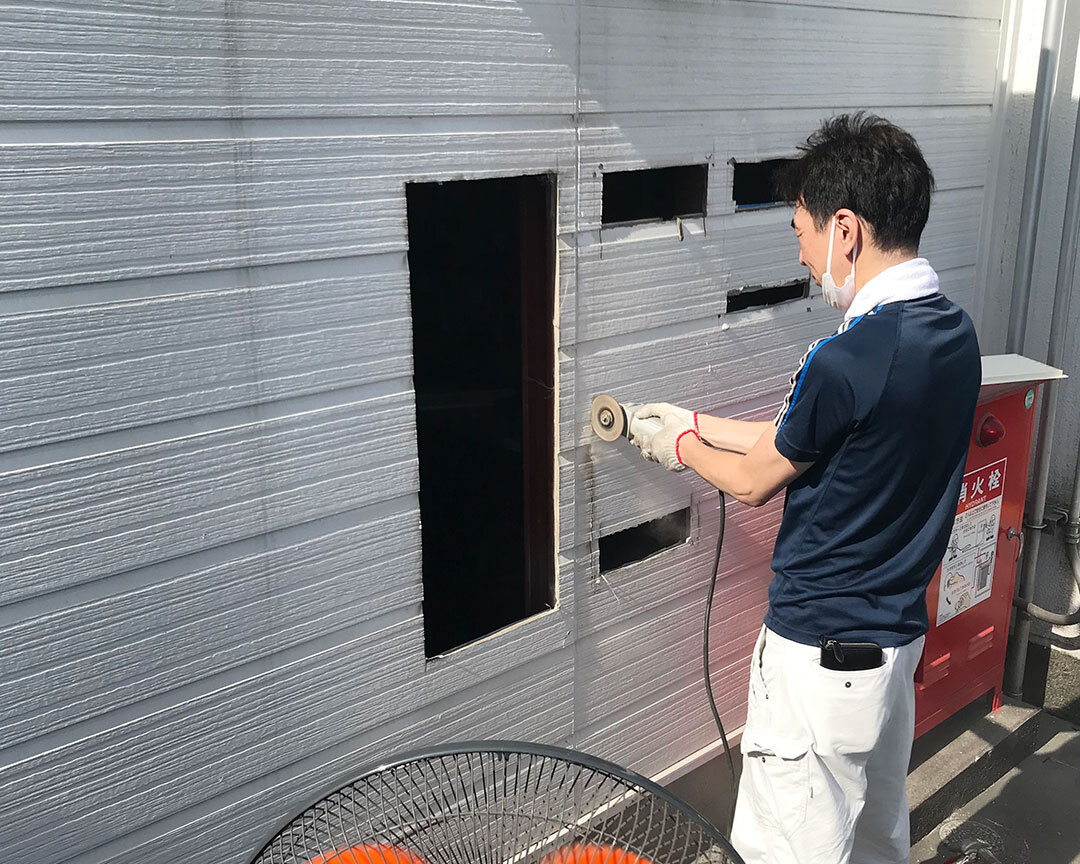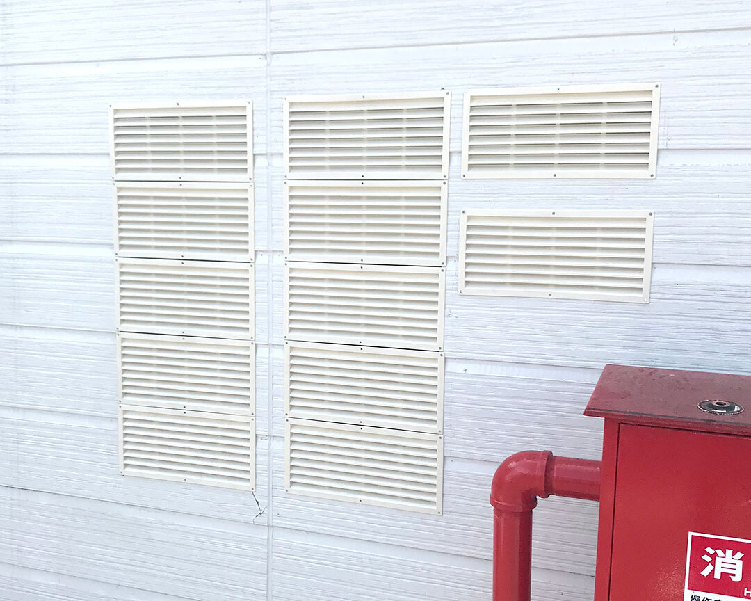 (下左)こちらはコンプレッサー室の壁面。夏場は照りつける日射しと機械熱で室内の温度がグングン上がります。その対策として壁面に通気口を設け、温度上昇を抑えようという試みです。