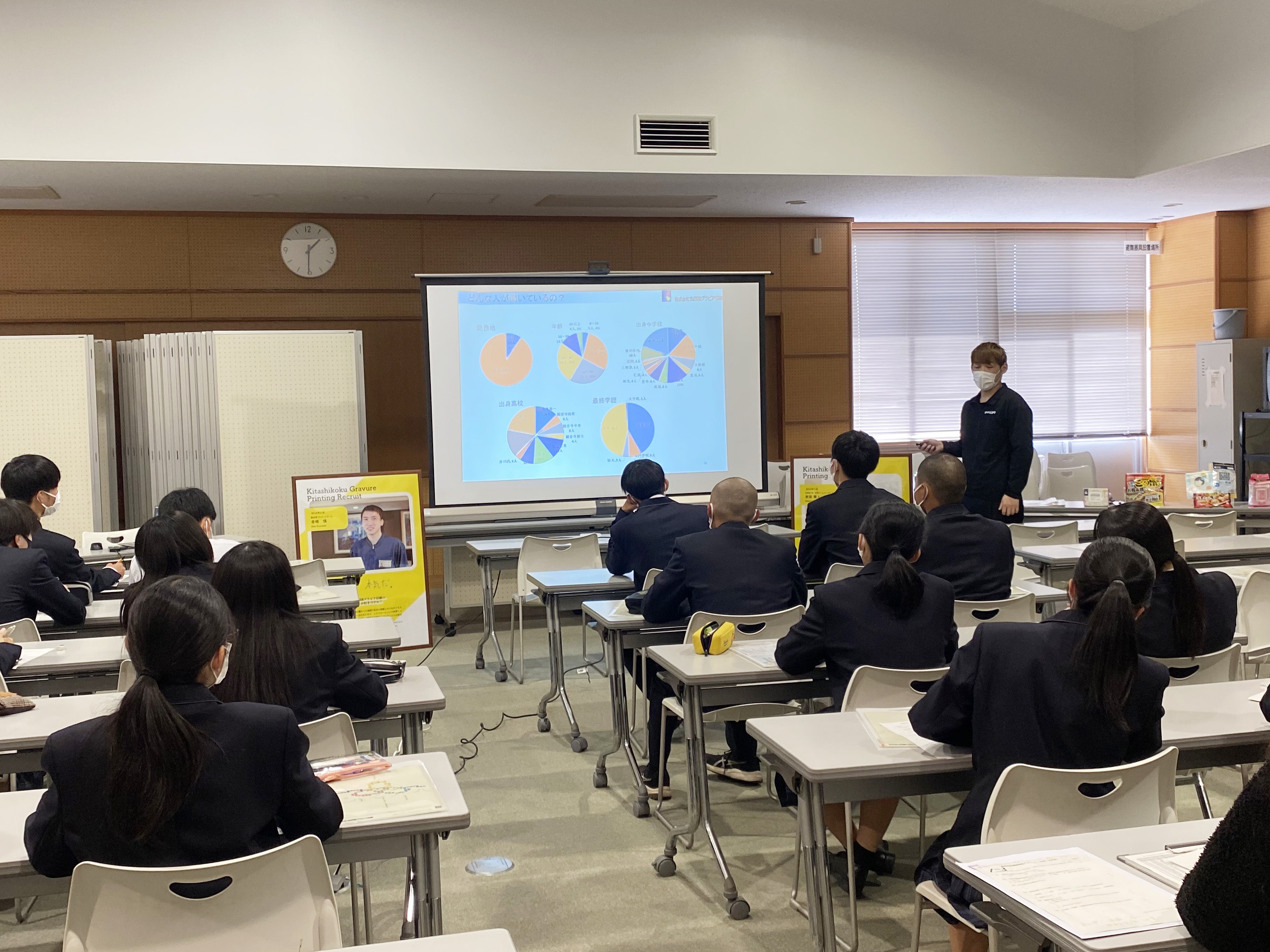 これは、若年層の地元での就職促進のために行政が行っている取り組みです。この日は観音寺総合高校にて行われ、当社からは人財開発メンバー1名、製造部から若手メンバー1名が参加しました。私たちの仕事を学生たちに知ってもらう機会はそう多くないため、こういった機会を大切にし、魅力を発信し続けます。この日説明を聞いてくれた学生さんから未来のグラビアーズが誕生するかも?