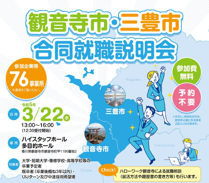 ハローワーク観音寺による、就職相談や就職セミナー(就職活動の仕方や履歴書の書き方について)も同時開催予定です。
