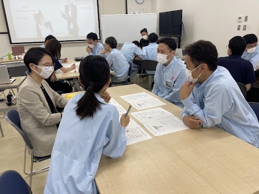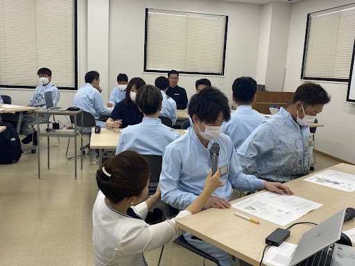 研修中は4~5人の小グループに分かれており、時折グループ内で話し合ったり意見を出す時間もあり、チームも年齢もバラバラで構成されたグループの中で、個々の意見を聞くことで新たな考え方に直面するシーンなどもありました。
