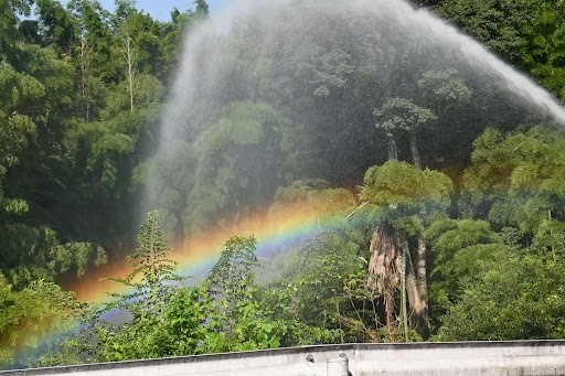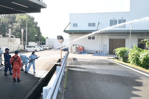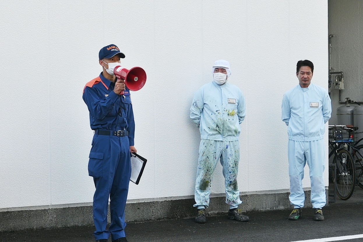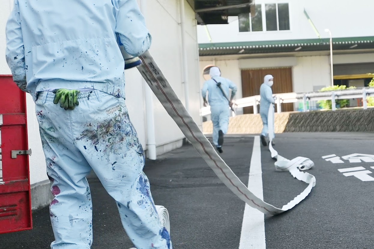 今年は香川県三観消防さまご協力のもとで行われました。火災を想定した非常ベルが鳴り響き、既定の集合場所へ素早く避難!避難訓練後は消火栓での放水を、選ばれし新入社員が体験しました。勢いよく放たれる水はなかなかに反動が大きく、消防団員グラビアーズが後ろで支えていながらも、その勢いに圧倒されていました。当日は天候にも恵まれ、青空に向かって放たれた水によって綺麗な虹がかかっていました。
