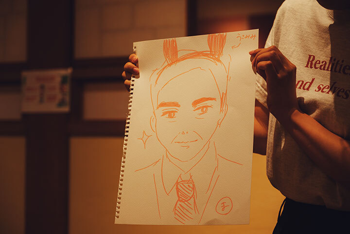 あいにくの雨模様で月見は叶いませんでしたが、美味しいご飯をたらふくいただいて、楽しい初秋のひとときを過ごすことができました!似顔絵当てゲームでは、社長の似顔絵を描くという大任を仰せつかり、どんな作風にしようかと頭を悩ませつつも、勢いのままに少女漫画に出てきそうなキラキラオーラ全開の社長像を描かせていただきました。