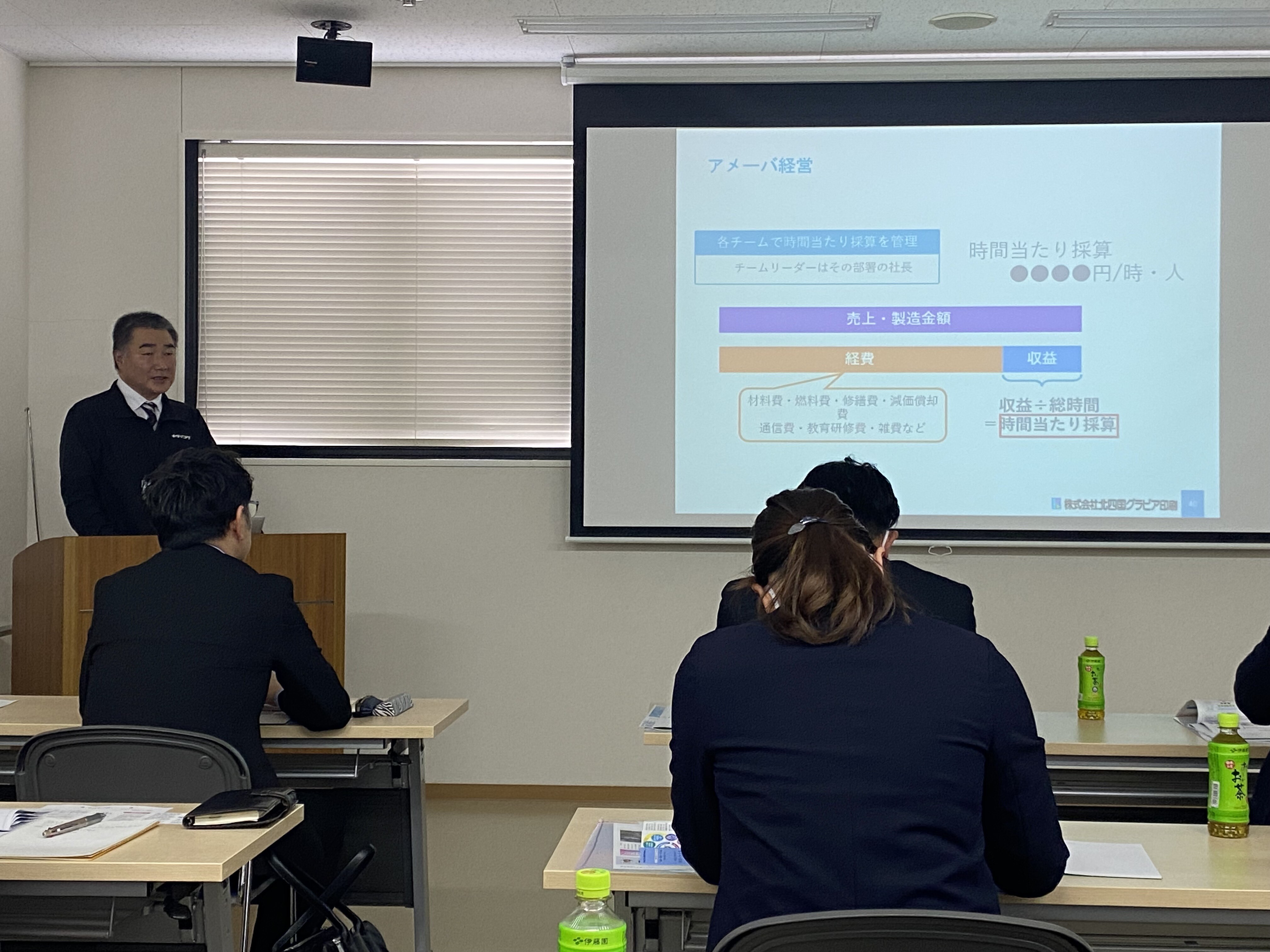 初めは社長から経営理念の策定やいろいろな取り組みを開始した時の想いをお伝えさせていただきました。その後は、入社2カ月の社員から役員まで5人のグラビアーズが取り組み内容について、発表しました。