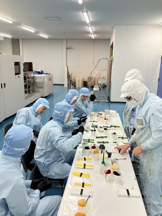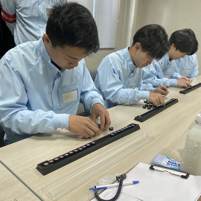 オリジナルラベルづくりや色合わせ体験のほか、調色や梱包作業など、現場の業務に近い作業にも取り組んでいただきました。また、食品安全に関わる取り組みとして、工場入室時の手順や手洗いの徹底についても学んでいただき、安全・衛生管理の重要性をお伝えしました。
