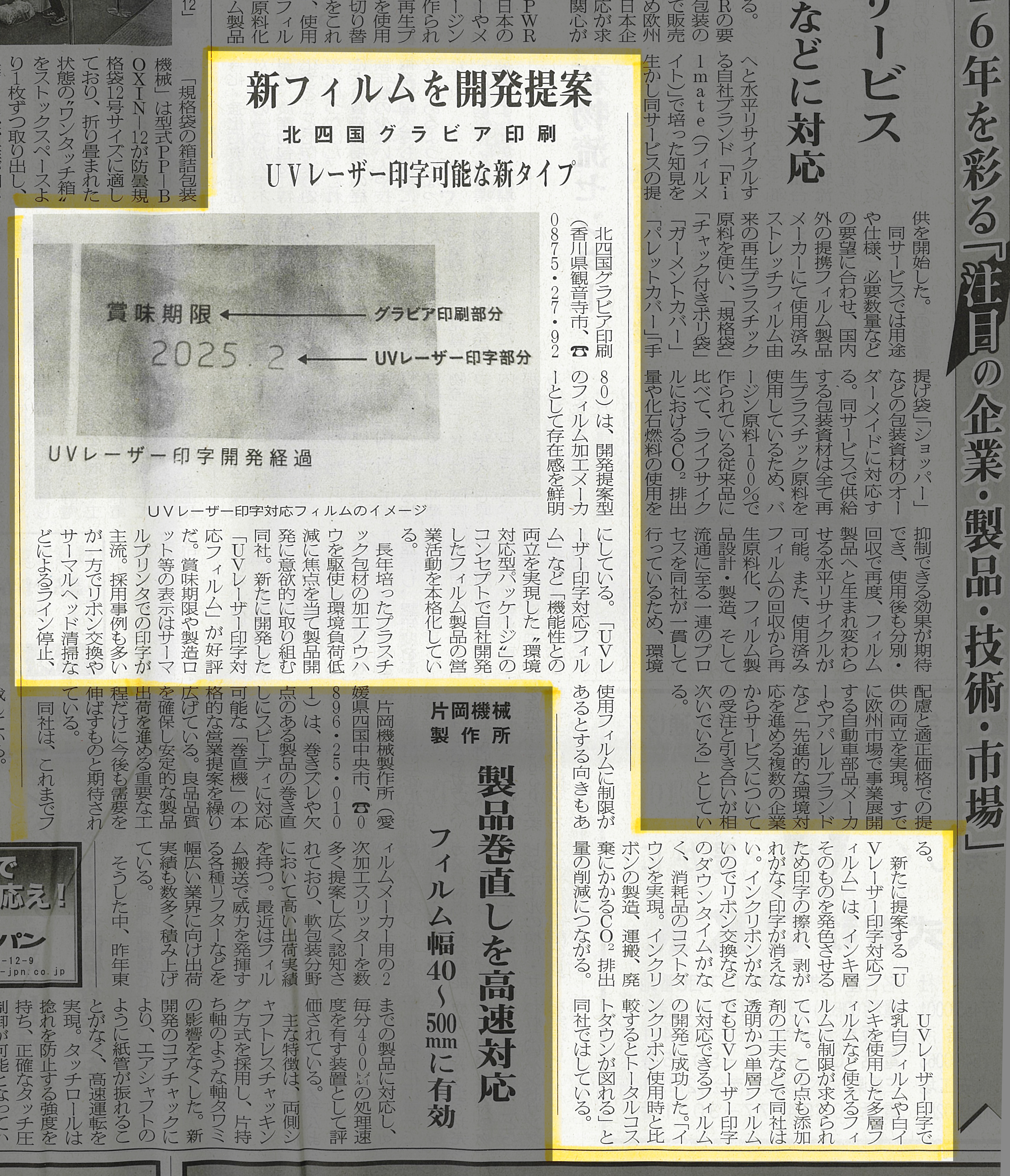 包装タイムスNo.3197に弊社の「UVレーザー印字対応フィルム」についての記事が掲載されました