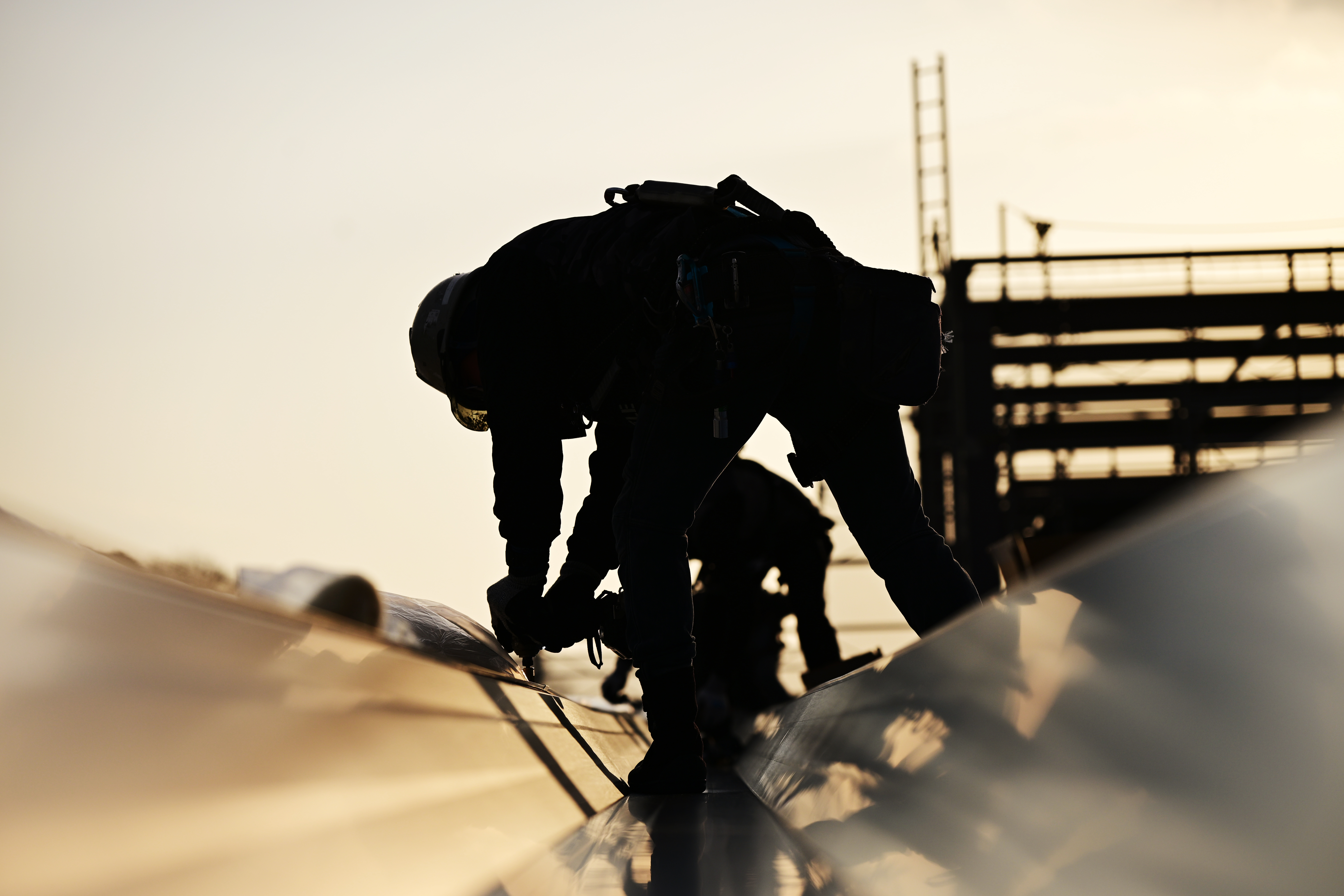 建築現場で材料を加工して屋根材を製作し、