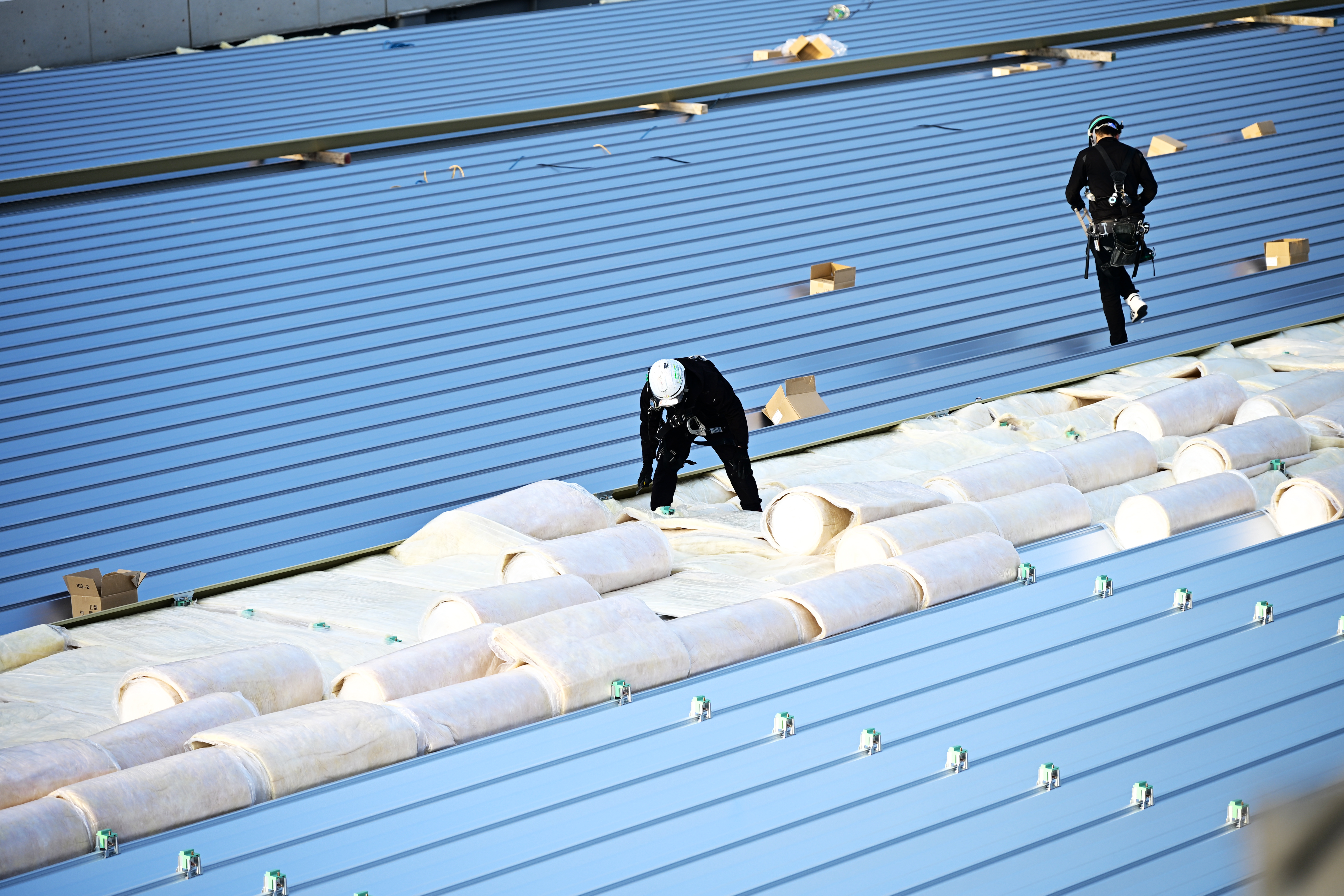 広大な敷地面積を有する本工場の屋根施工では、