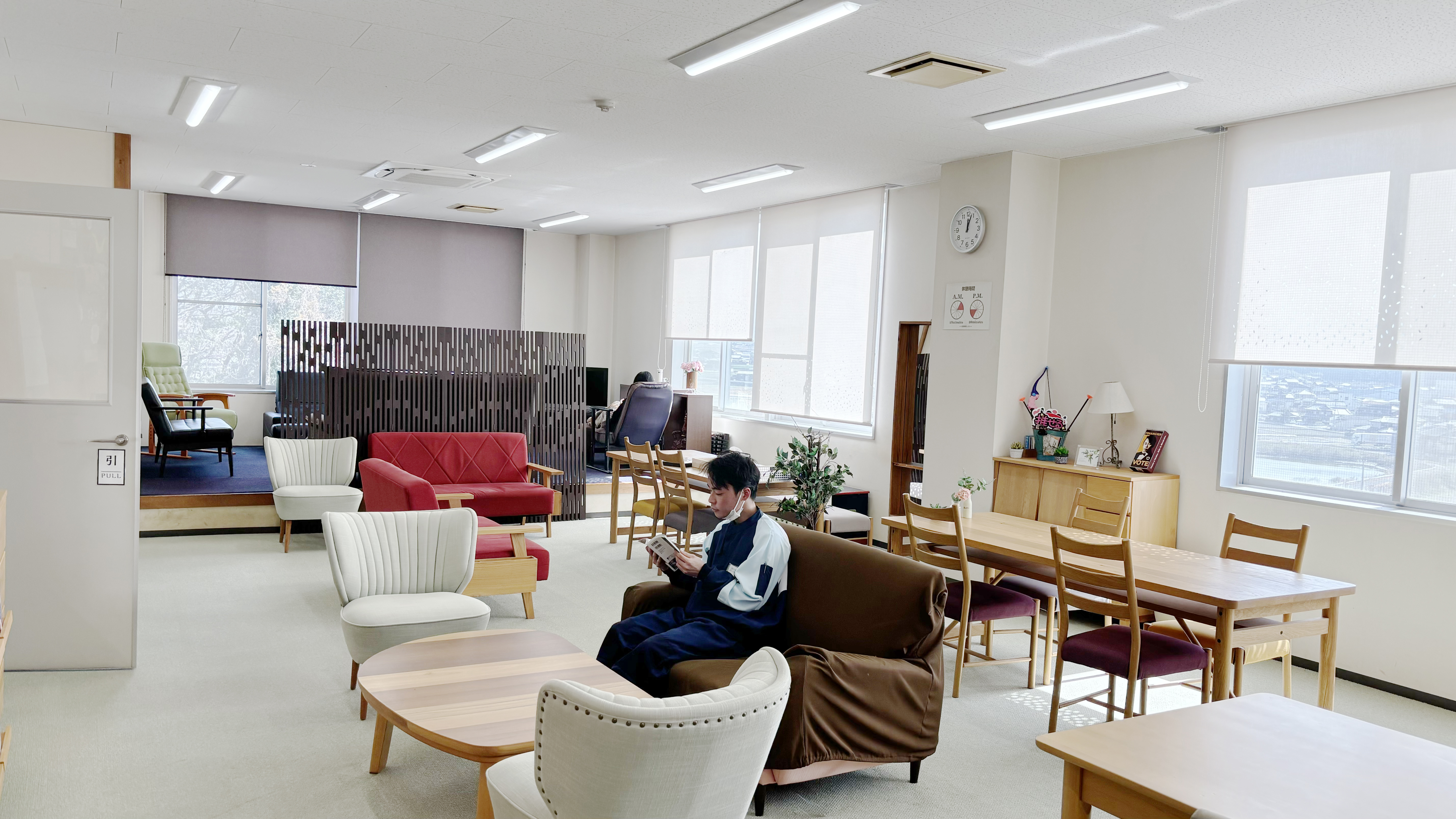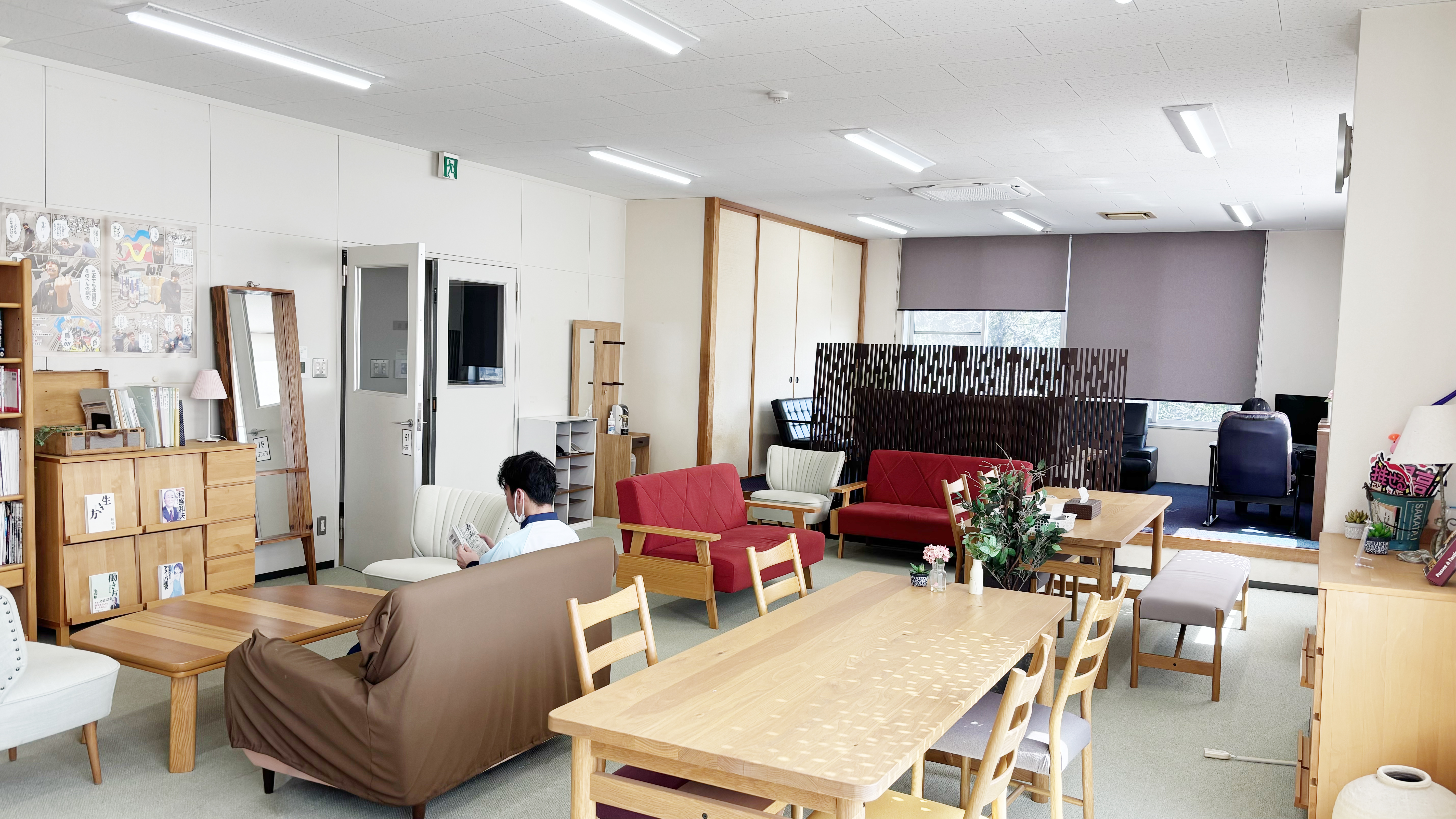 休憩室は、業務の合間に心身をリフレッシュしたり、社員同士が談笑したりする場として、多くの社員に利用されています。