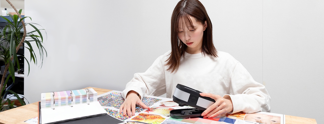 印刷の色がお客さまの求める色になるようにデータを調整する色校正という作業と、印刷適正を考えた版のデータを作成する業務を行なっています。どちらも最終仕上がりを見据えた細かい作業になるので、念入りにお客さまや営業チームの社員と打ち合わせを行い、ミスのない作業を心がけています。