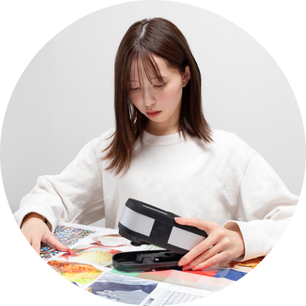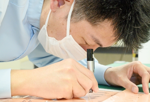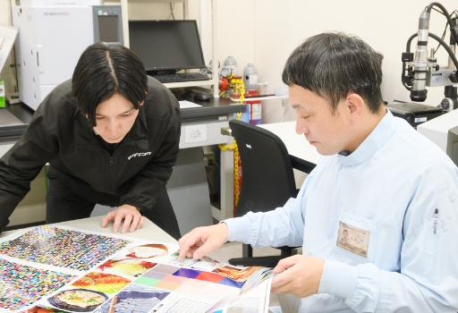 すべての製品は、品質保証チームの許可がなければ出荷できません。お客さまに安心して使用していただくため、基準を満たしているかなどをお客さまの目線でジャッジします。また常に「品質」に関する働きかけを行い、製造工程全体の意識を向上させることが品質保証チームの使命です。印刷機や製造設備に関する知識はもちろん、工場内の多くの部門のスタッフと綿密なコミュニケーションを取り続けることも必要です。
