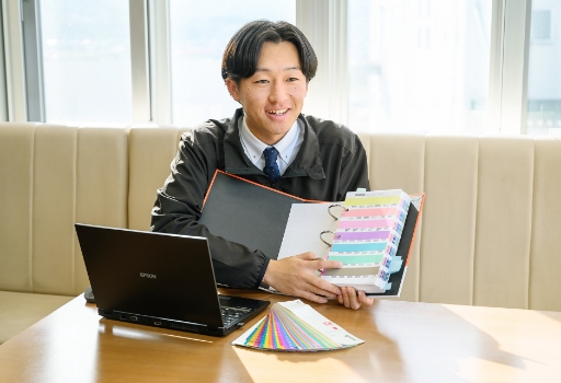 本社に拠点を置き、四国を中心に西日本エリアを担当しています。地域のお客さまが多いため、日々のコミュニケーションを大切にし、信頼関係を築きながら最適な提案を行っています。また、お客さまの工場に出向いて新商品のラインに立会いを行うほか、万が一のトラブルの時には真っ先に駆けつけて問題に対処する北四国グラビア印刷のフロントマンの役割を果たします。