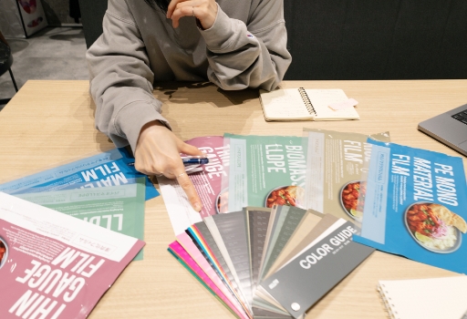 商品の売り上げをも左右するパッケージだからこそ、鮮やかでシズル感あふれるカラー表現を可能にする10色印刷機を導入しています。資材の目的用途に応じたラインで高品質を実現するとともに、業界では最も難しいとされる食品写真を多用したパッケージを創業時からメインに扱い、常にチェック&リメイクをくり返し、さらなる品質の向上をめざしています。