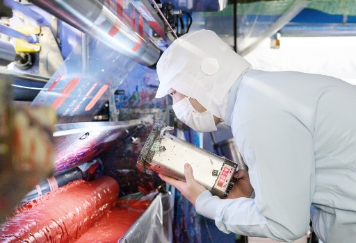 パッケージの中身を安全に保護するためのラミネート。それぞれ異なるフィルムを接着剤で貼り合わせることで、食品など内容物の賞味期限を延長させることができます。食品パッケージを多く製造している弊社では環境にも配慮し、溶剤を使用しないラミネート技術(ノンソルベントラミネート)も導入しています。