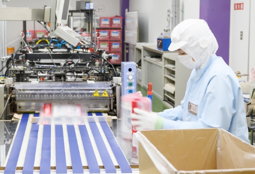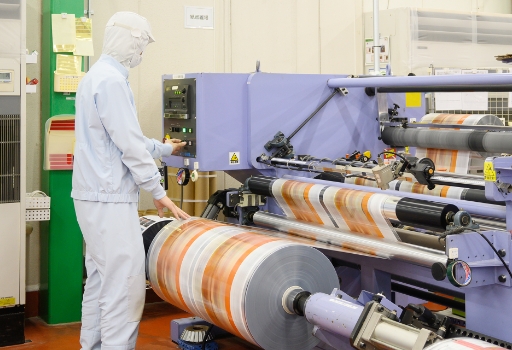 平面であるフィルムを立体の袋へと変化させる工程です。 生活者が使いやすい形状に仕上げるため、さまざまな形や切り口などが求められます。職人技とも言える微妙な機械調整でパッケージを形成していきます。