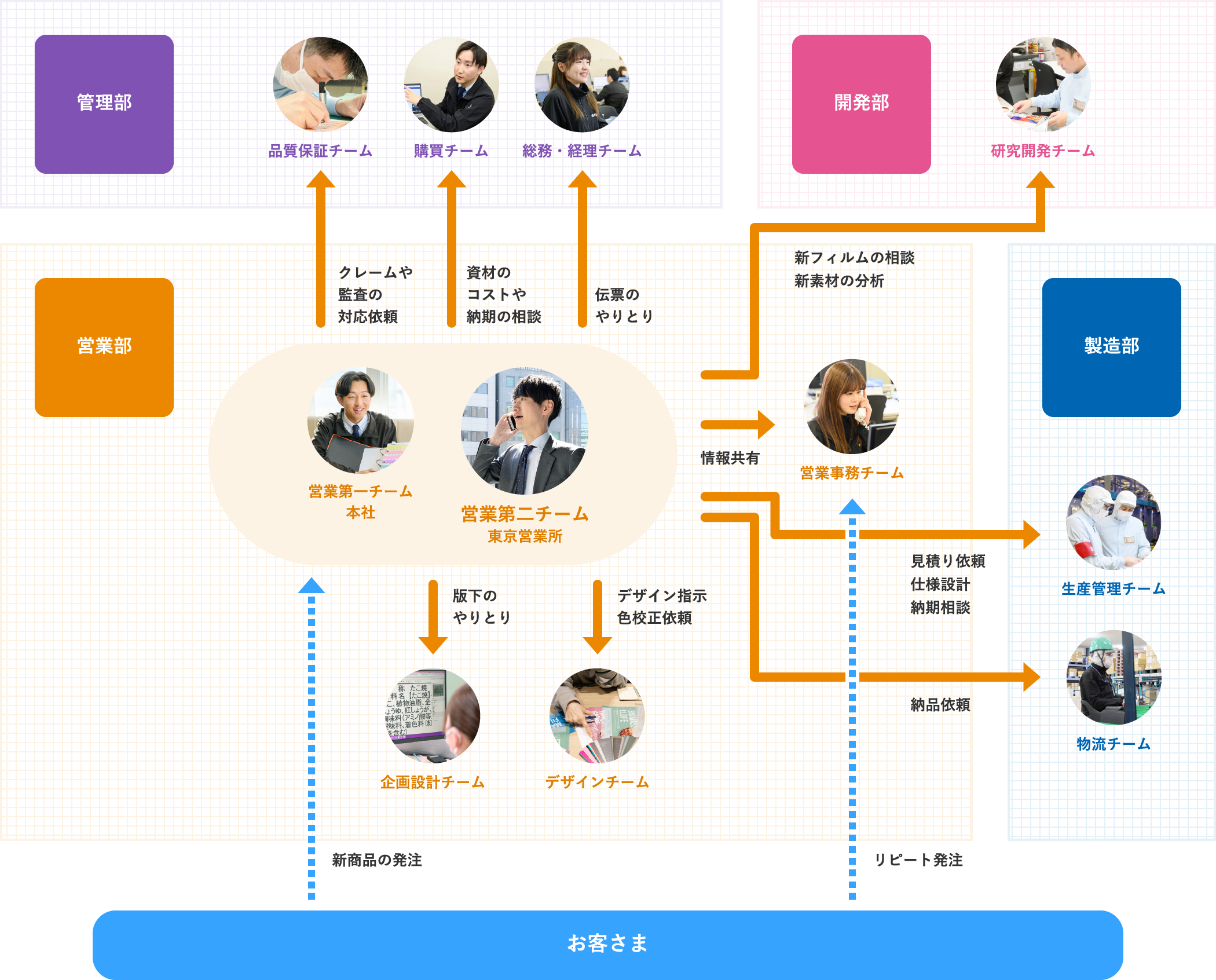 北四国グラビア印刷の営業第二チームは、首都圏を中心に大手食品メーカーさまをはじめ、さまざまな業種のお客さまのパッケージに関する課題やお悩みに寄り添い、最適なソリューションを提案するチームです。