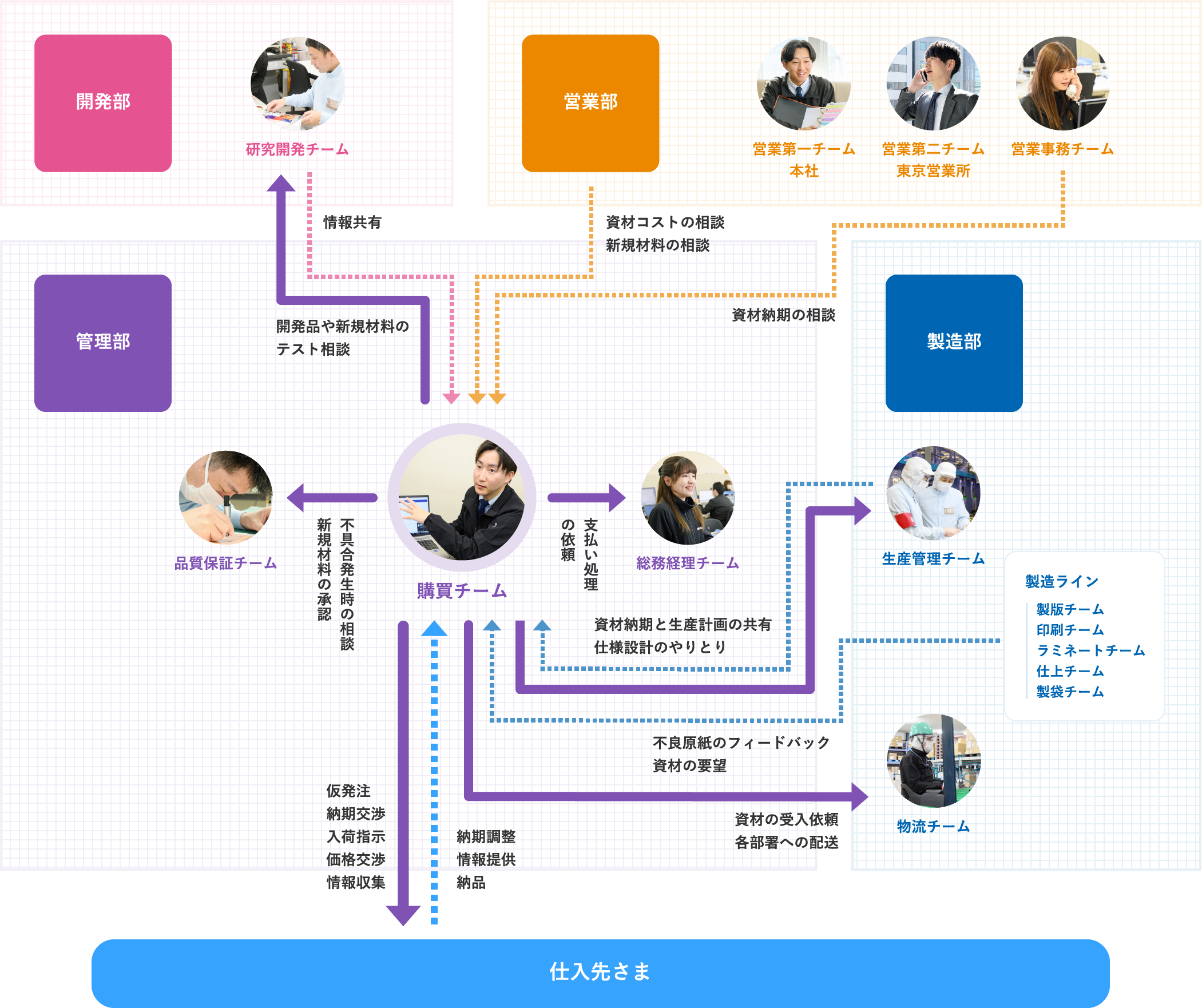 購買チームの使命はお客さまに求められるパッケージを安定供給するために、必要な資材を適切な品質、価格、納期で調達することです。