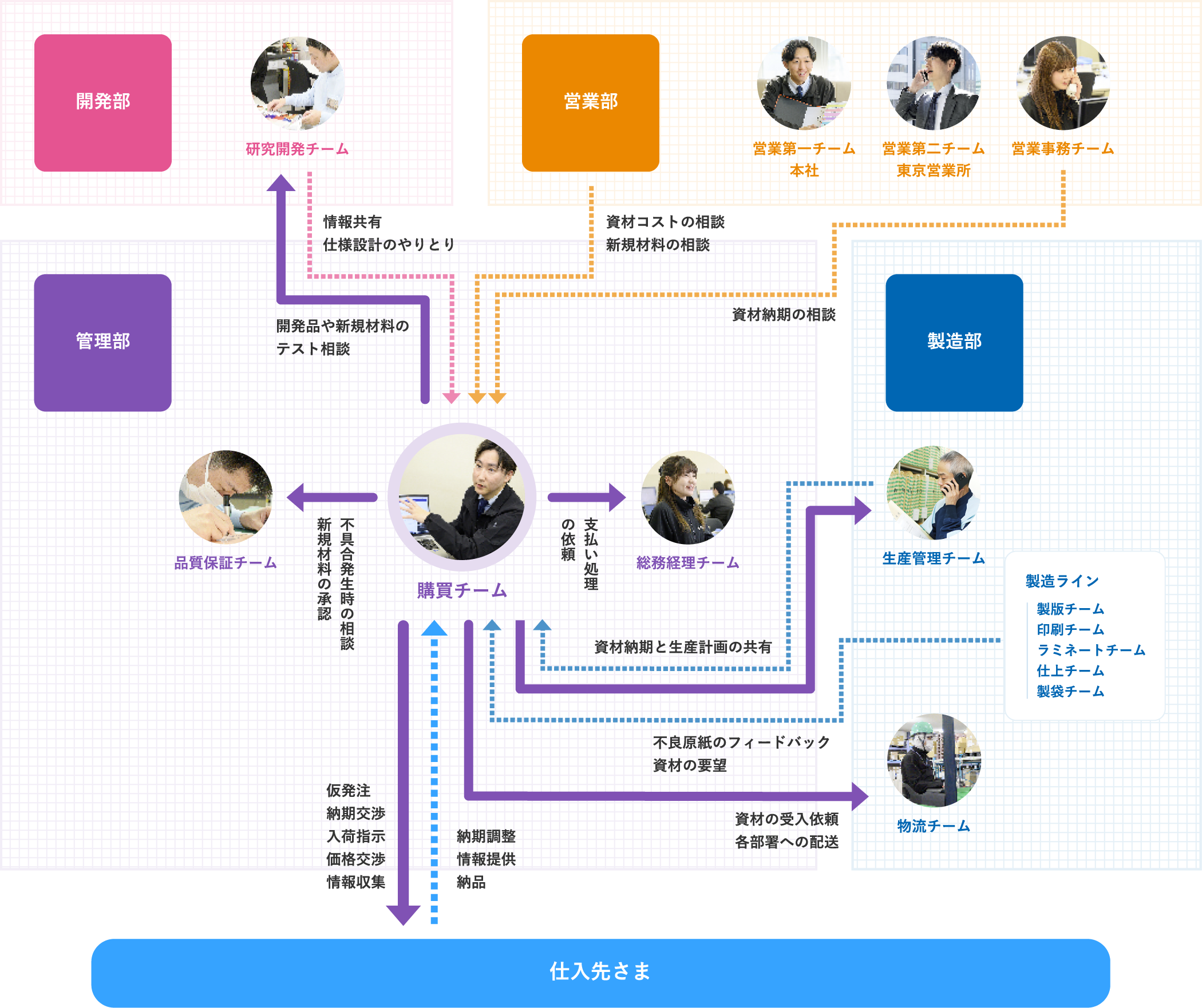 生産管理チームなど、他部署とのコミュニケーションを取りながら、迅速で無駄のない資材調達が求められます。